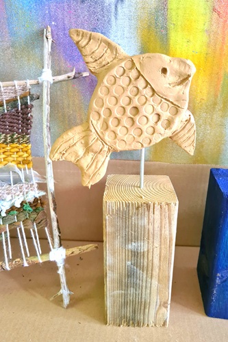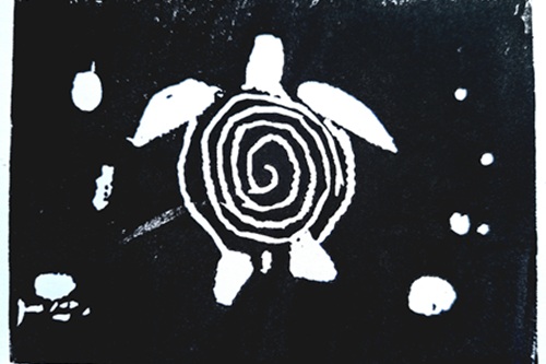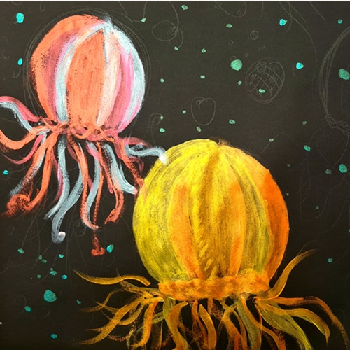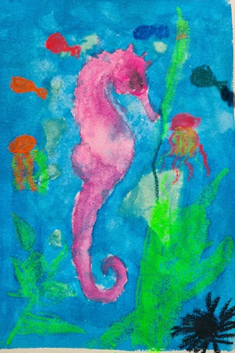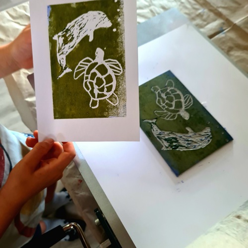 Tief unter der Meeresoberfläche schwamm die Riesenschildkröte Tiramel durch Korallenpaläste, begleitet von Nymphen mit Haaren wie tanzendes Seegras. Die Kinder druckten Schildkröten, Delfine und Fische mit Linol, malten glitzernde Quallen, Seepferdchen und Riesenmuscheln mit Acryl, Strukturpaste und Ölpastell. Muschelmobile erzählten Geschichten vom Leben unter Wasser.