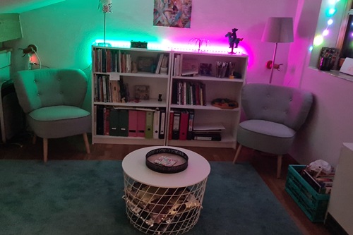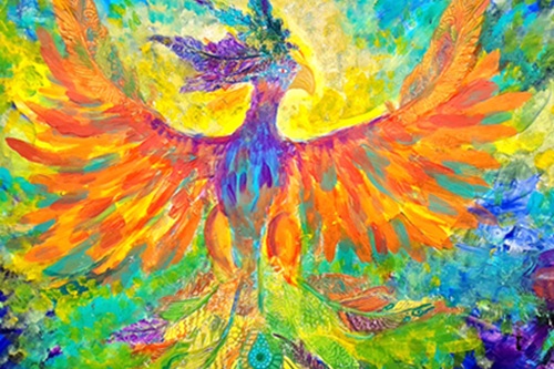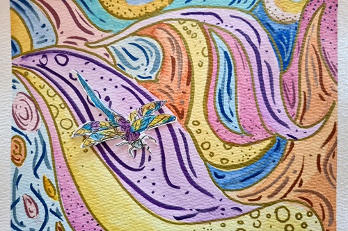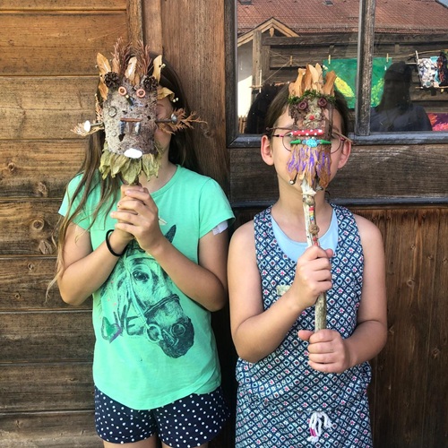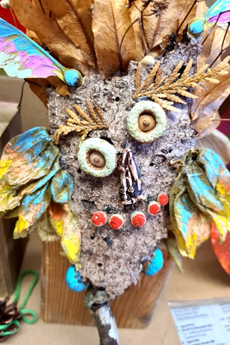 Hier flatterte die Libelle Virellia über den Teich der Erinnerungen, während der Phönix mit seinem leuchtenden Gefieder durch die Lüfte zog. Die Kinder bastelten Naturgeister aus Moos, Rinde und Ahornflügeln, webten mit Naturmaterialien und gestalteten Traumfänger. In Aquarell entstanden mystische Landschaften, in denen Libellen tanzten, das bunte Gefieder des Phönix wurde mit Acryl und Strukturpaste gestaltet.
